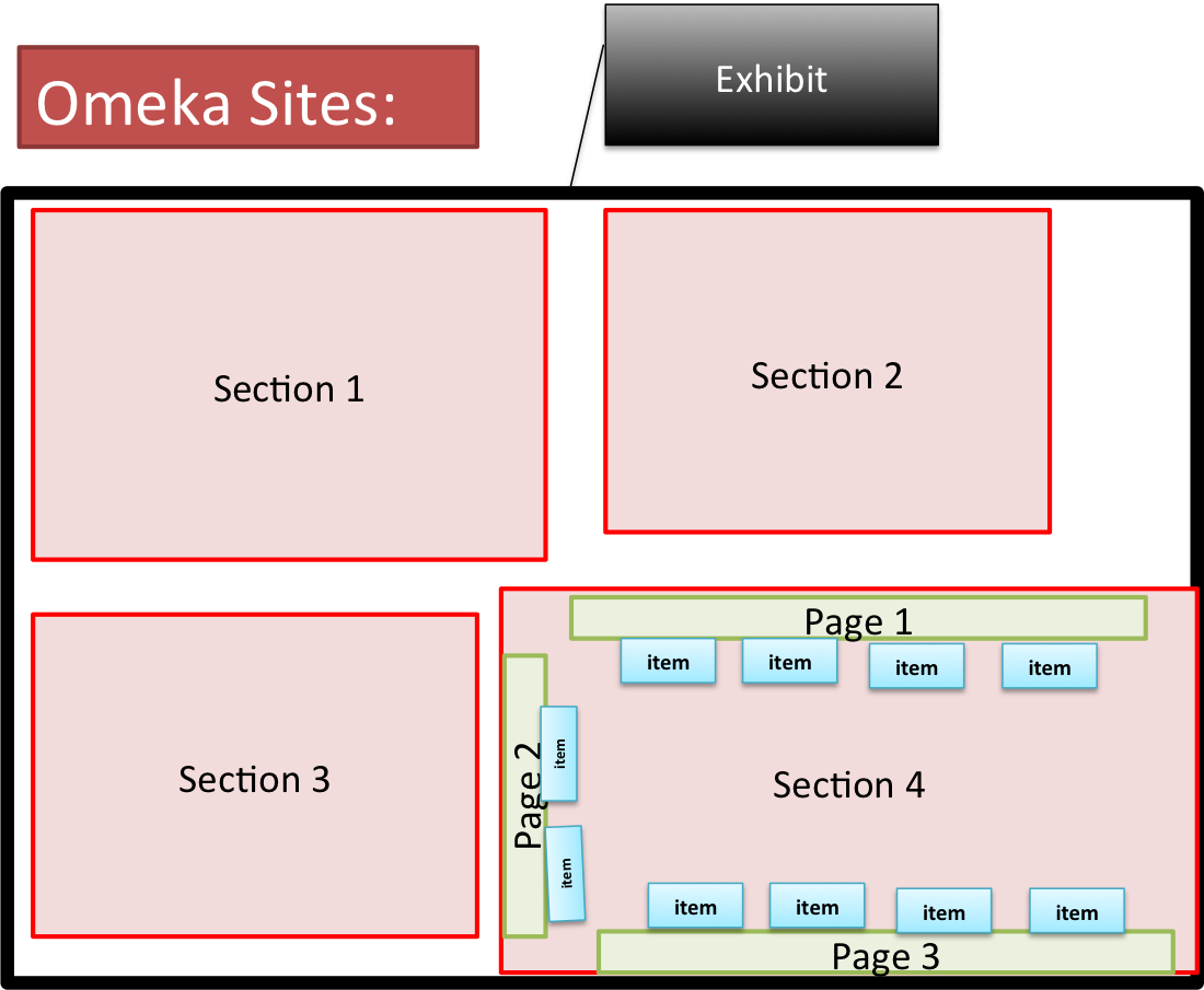 Here’s a visual rendering of the relationship between Exhibits, Sections, Pages, and Items in Omeka.