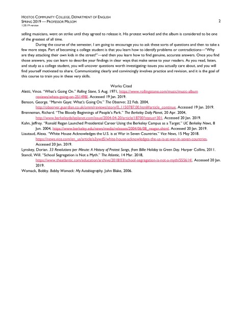 I’m putting this all there partly to have something to point to when I tell them to write an essay. It foregrounds the actual work of our course: writing about stuff we care about. It shows that I am a writer too, and I am insecure about how I write. It does things I expect of their writing: it includes parenthetical citations, probably has some errors or typos, includes a block quotation, and has an MLA Works Cited at the end. The essay also rationalizes the course’s focus (read the end), which is inspired by the story I read about why Obie Benson wrote the song. (Al Benson helped write the lyrics.) After witnessing police shoot thousands of protesters during the “Bloody Thursday” protest in Berkeley in May 1969 . . . No, just read what I wrote, because I find myself on the verge of re-writing the essay. The story is moving and felt just so pertinent in this era of MAGA hats and walls and family separations.